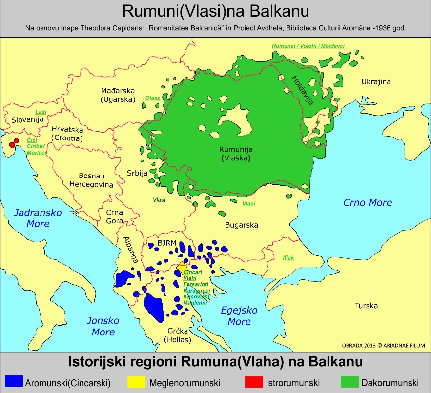 Orjentaciona mapa regiona Balkanskog poluostrova koje naseljavaju Vlasi, za detalje pročitati Kapidanov rad
